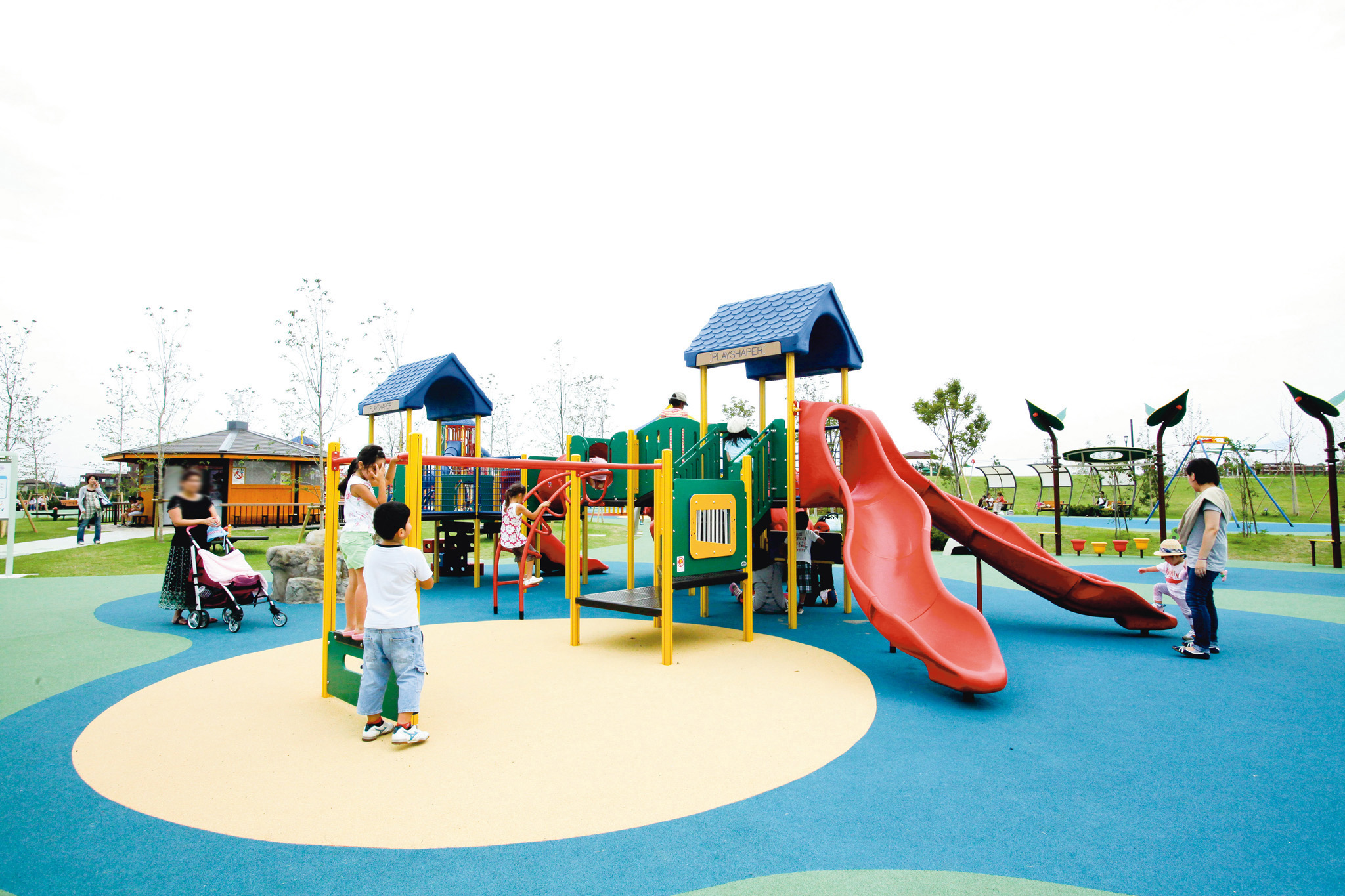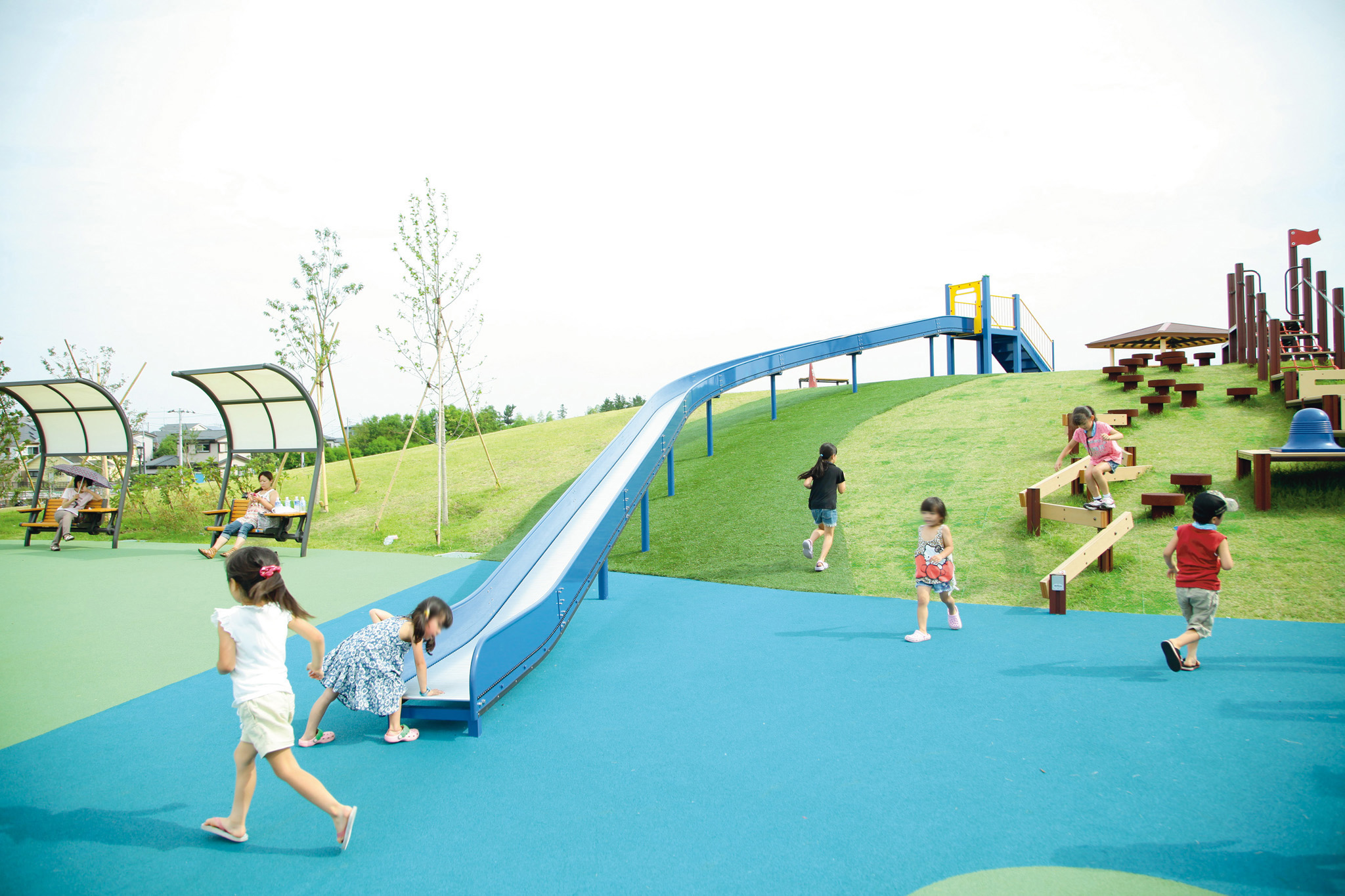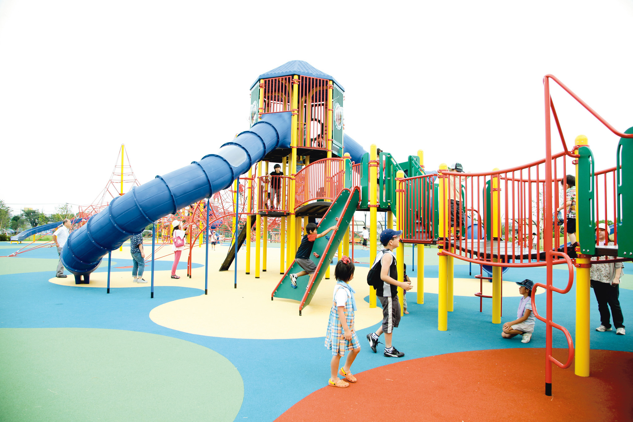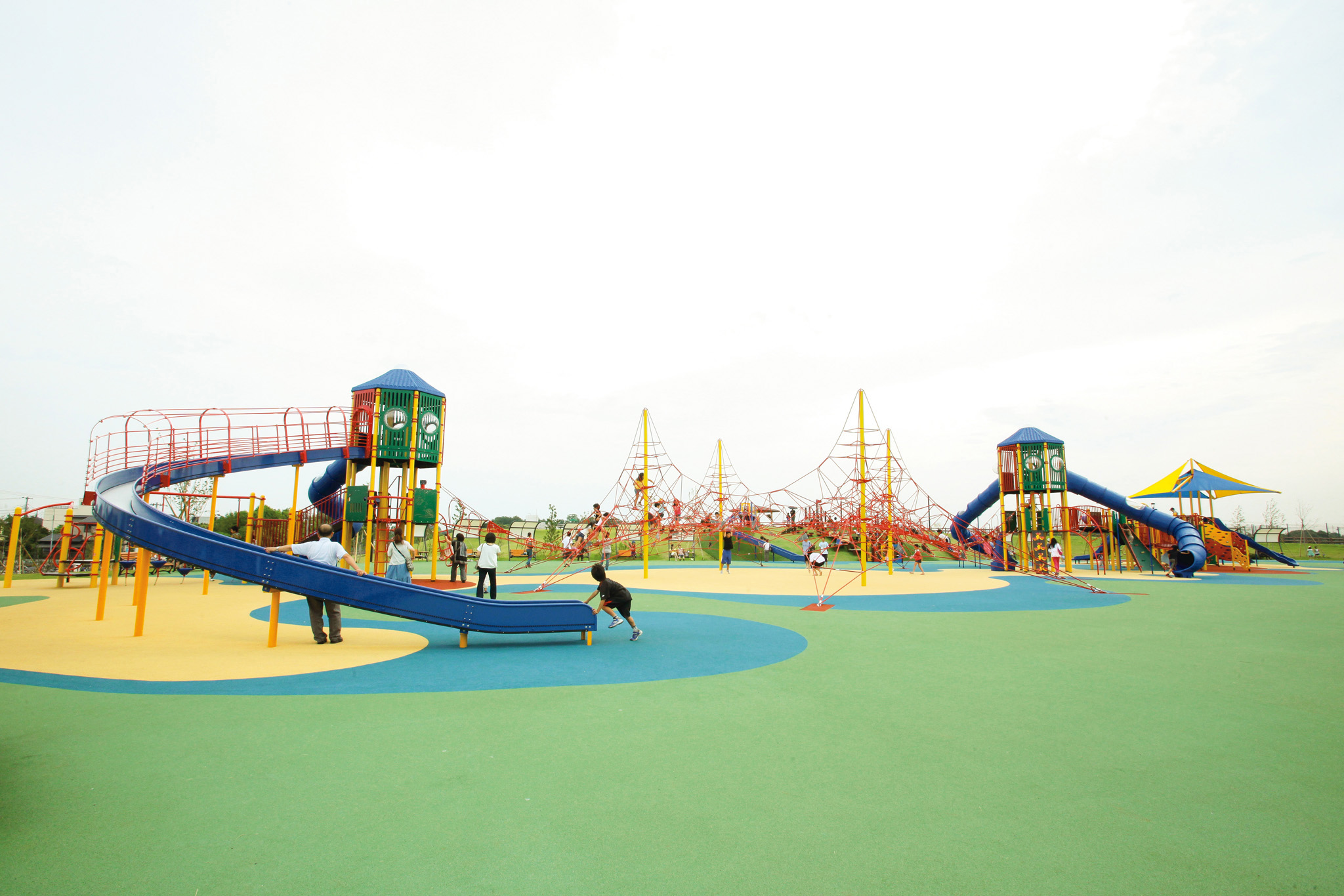 大型複合遊具やふわふわドーム、ネット遊具、ターザンロープなどの遊具があります。バーベキュー広場や修景池などがあります。ダイヤモンド富士の眺めも楽しめます。