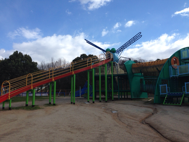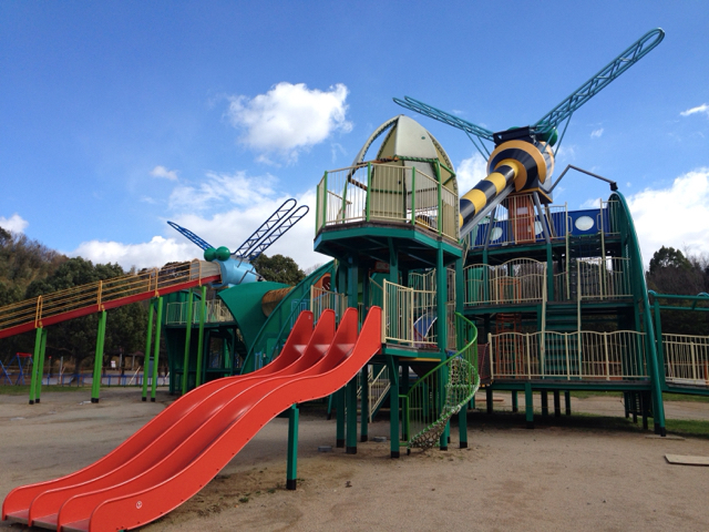 丘陵地帯にある公園で、斜面を利用した滑り台や、虫をモチーフにした大型複合遊具があります。バラ園やあじさい園、水仙郷もみじ谷など、四季折々の自然を楽しむことができます。展望台からは、晴天ならば大阪湾、明石海峡が望めます。